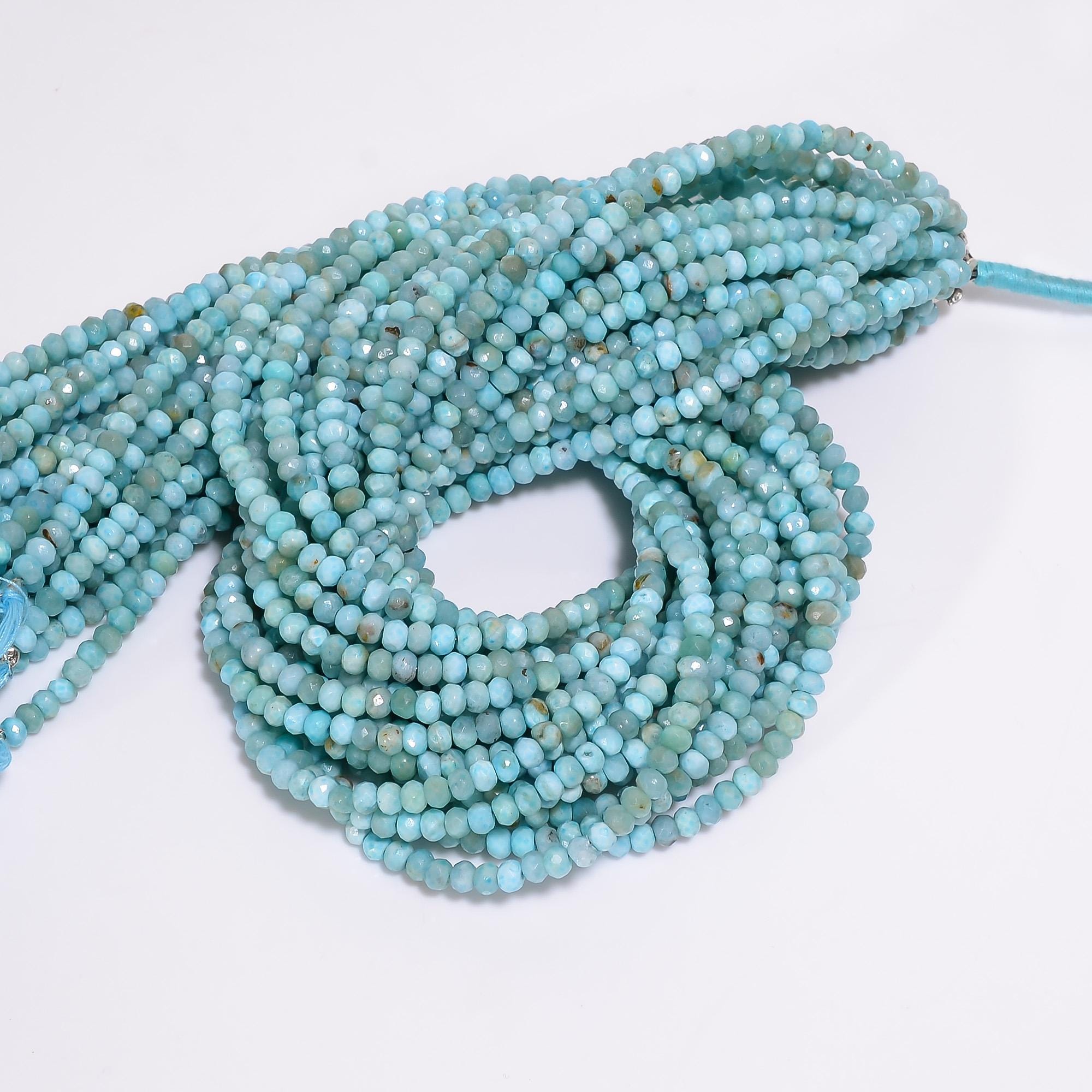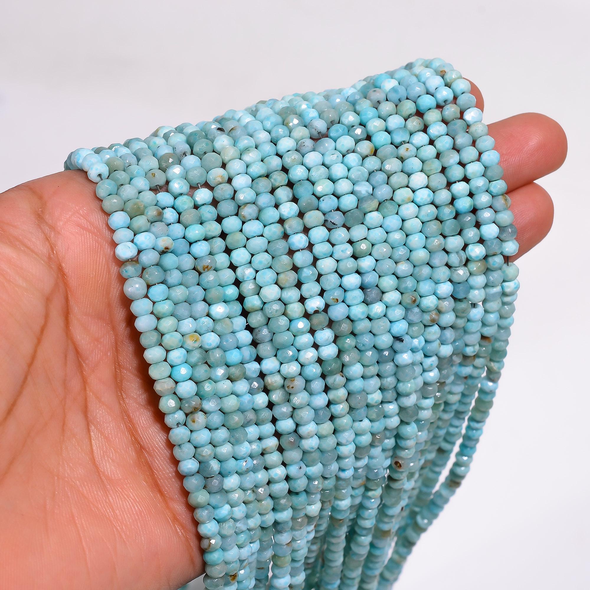 -Larimar micro faceted rondelle shape-bead size is from 3.80mm to 3.90mm-hole size of bead is about .50mm-strand length is 13 inches-this listing is for one strand-Larimar is a natural stone, no treatment