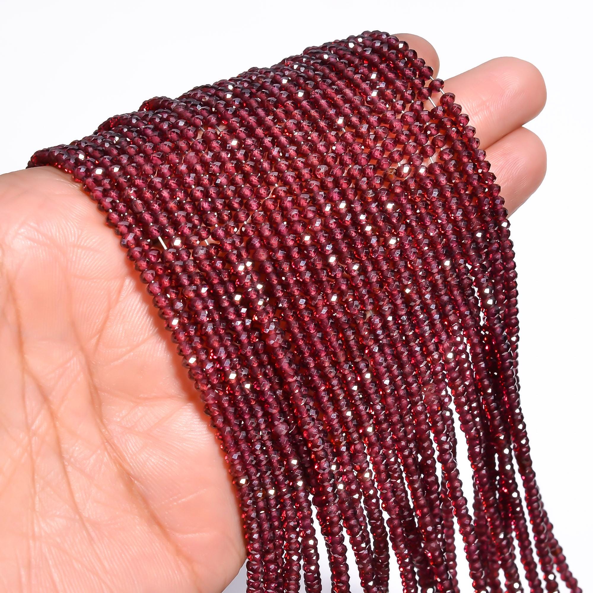 -Garnet micro faceted rondelle shape-bead size is from 2.90mm to 3mm-hole size of bead is about .50mm-strand length is 13 inches-this listing is for one strand-Garnet is a natural stone, no treatment