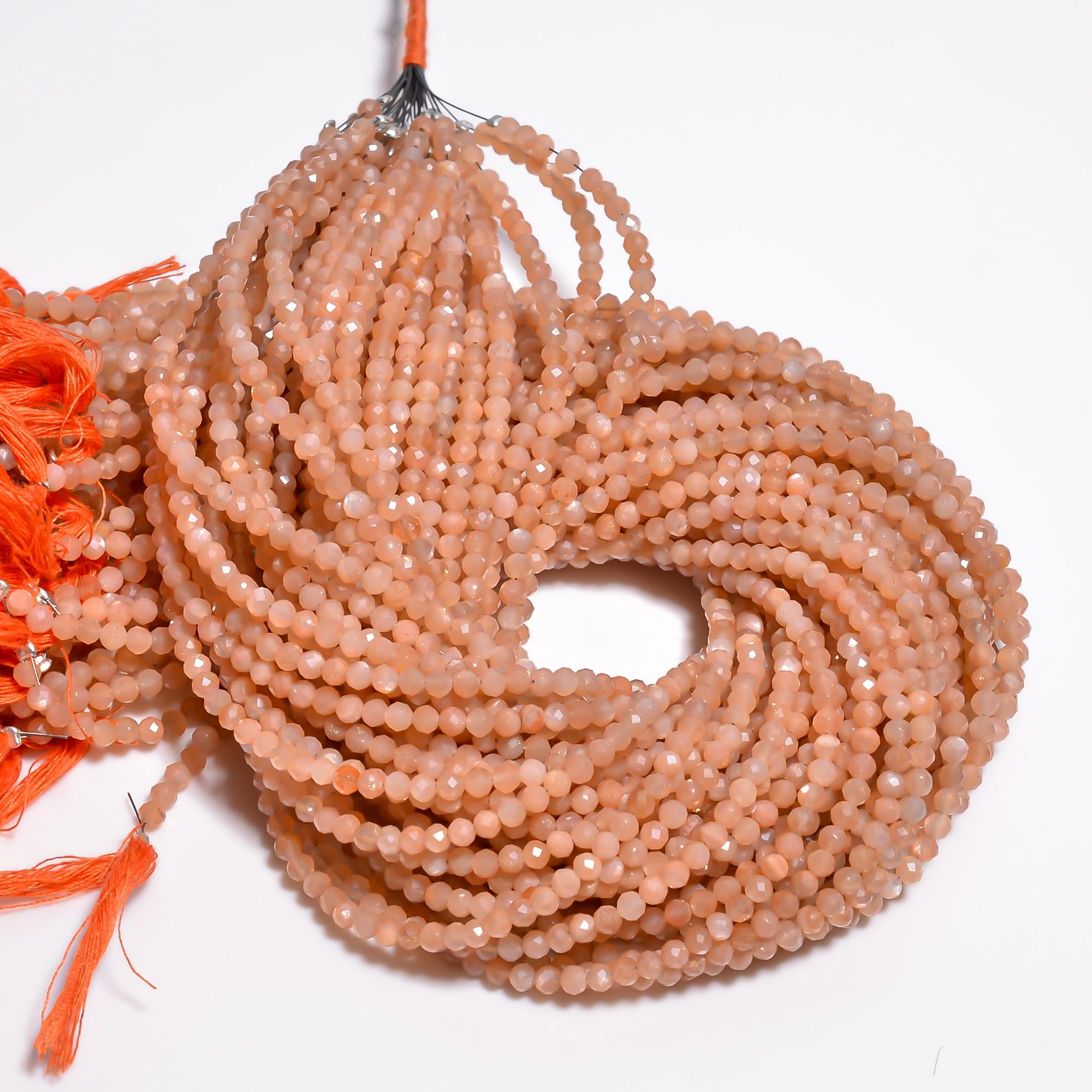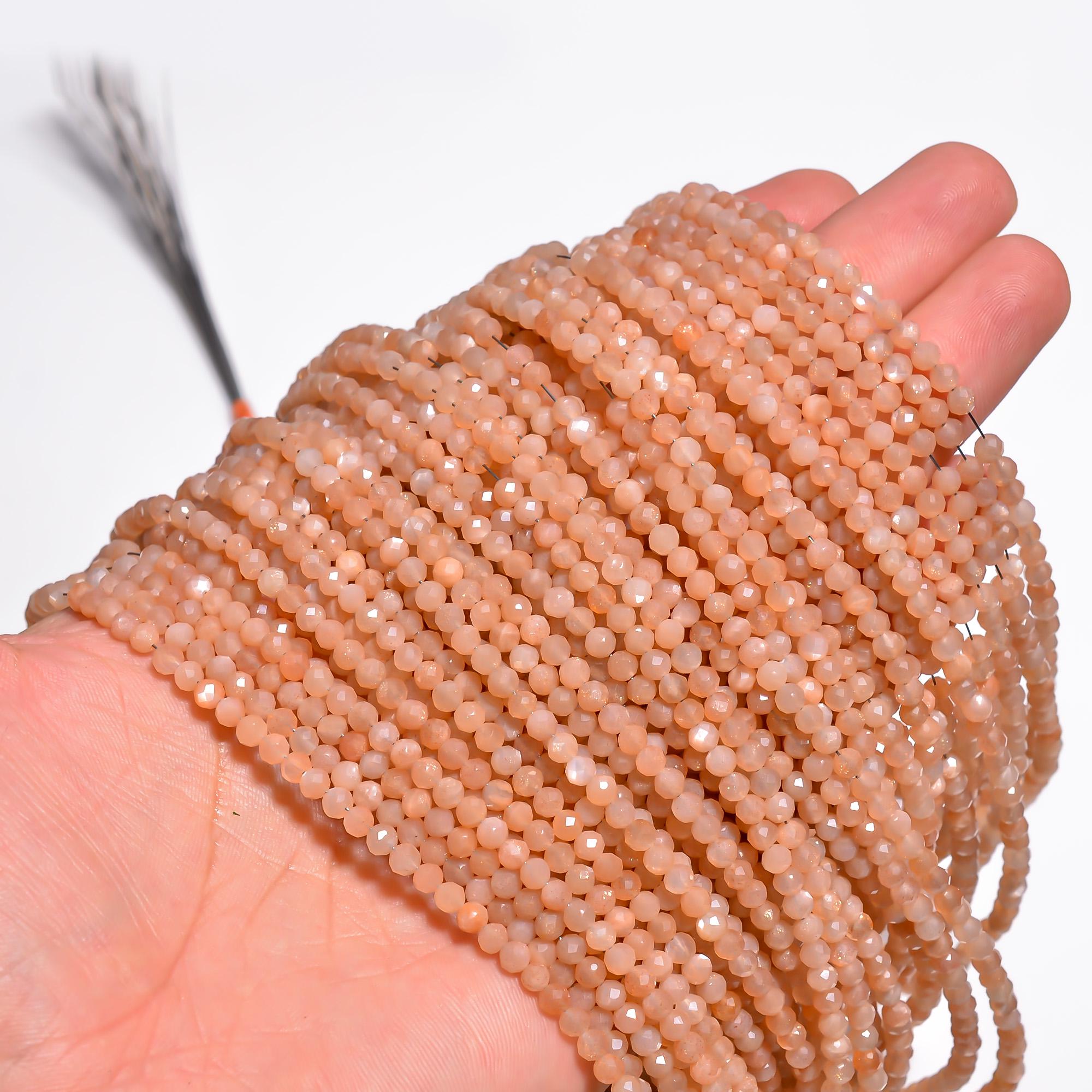 -Peach Moonstone faceted round shape-bead size is from 3.55mm to 3.65mm-hole size of bead is about .50mm-strand length is 13 inches-this listing is for one strand-Peach Moonstone is a natural stone, no treatment