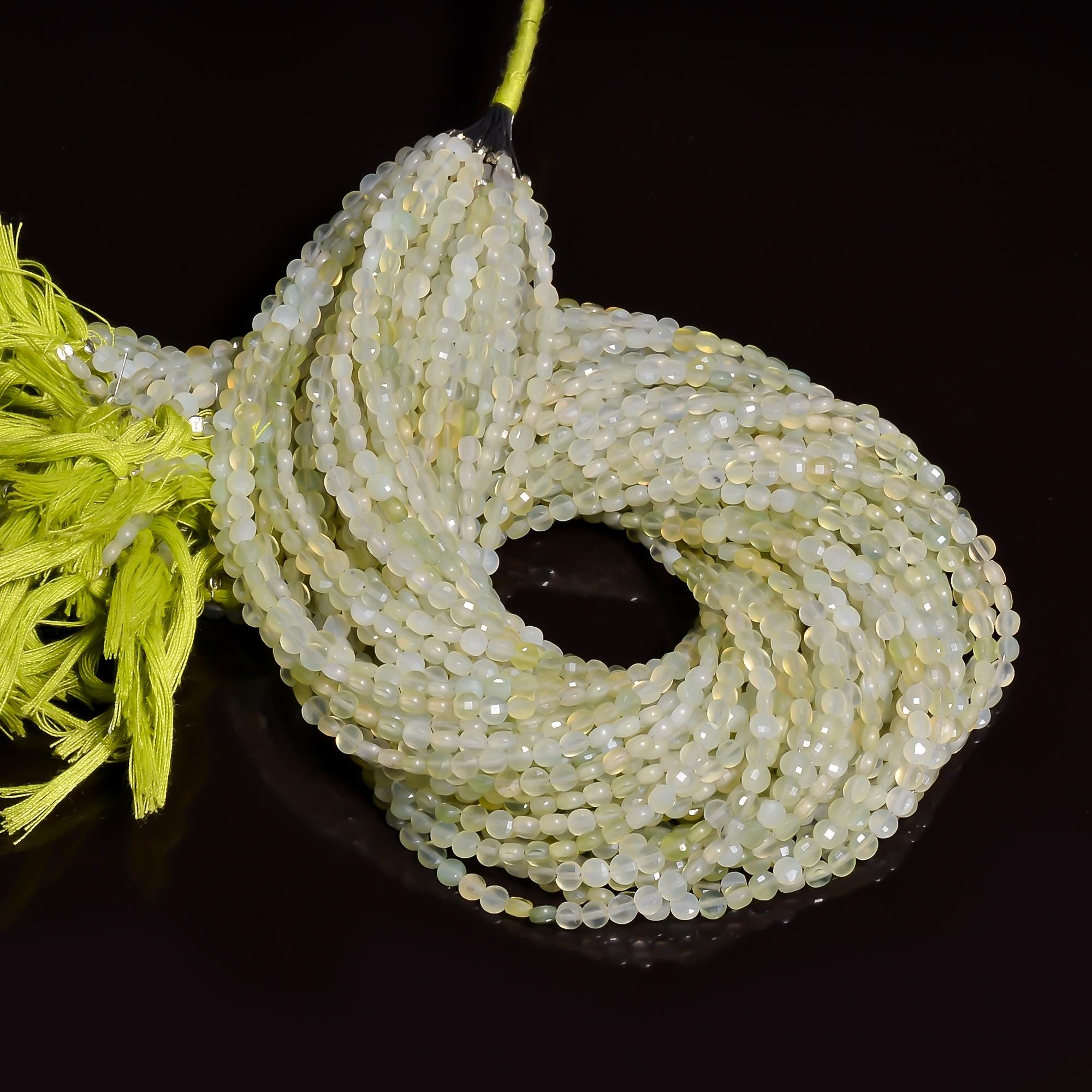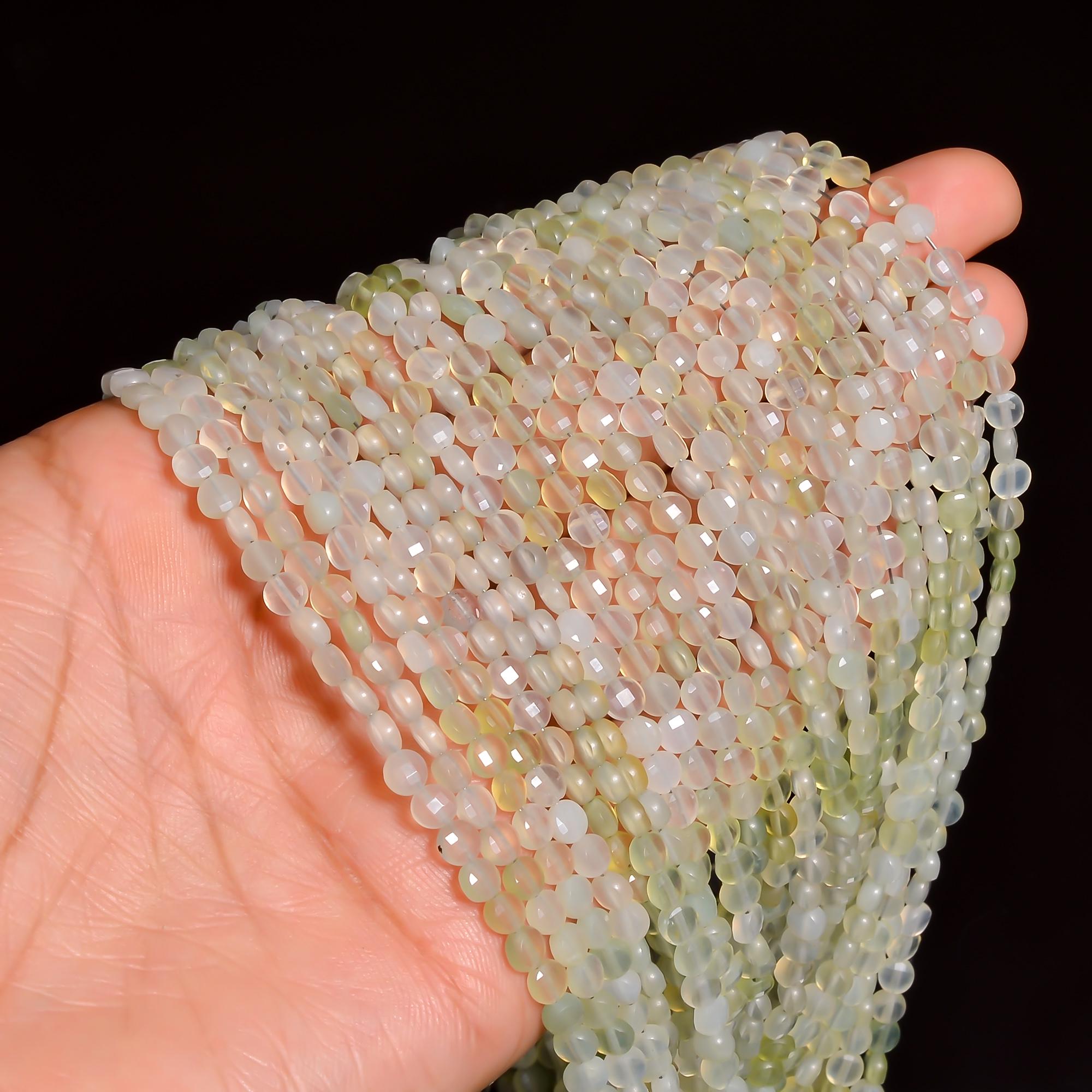 -Prehnite faceted coin shape-bead size is from 3.95mm to 4.05mm-hole size of bead is about .50mm-strand length is 13 inches-this listing is for one strand-Prehnite is a natural stone, no treatment
