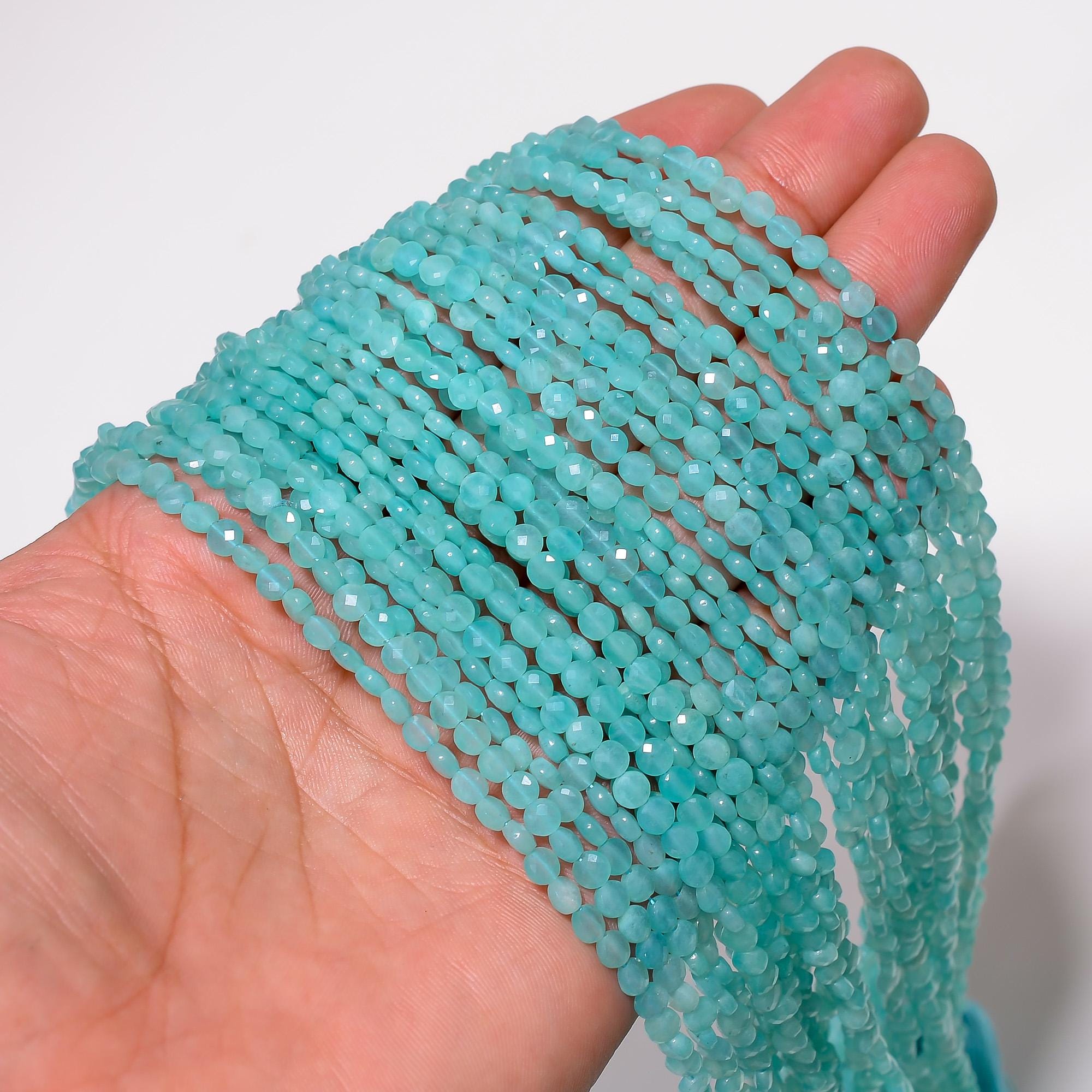 -Amazonite faceted coin shape-bead size is from 3.95mm to 4.05mm-hole size of bead is about .50mm-strand length is 13 inches-this listing is for one strand-Amazonite is a natural stone, no treatment