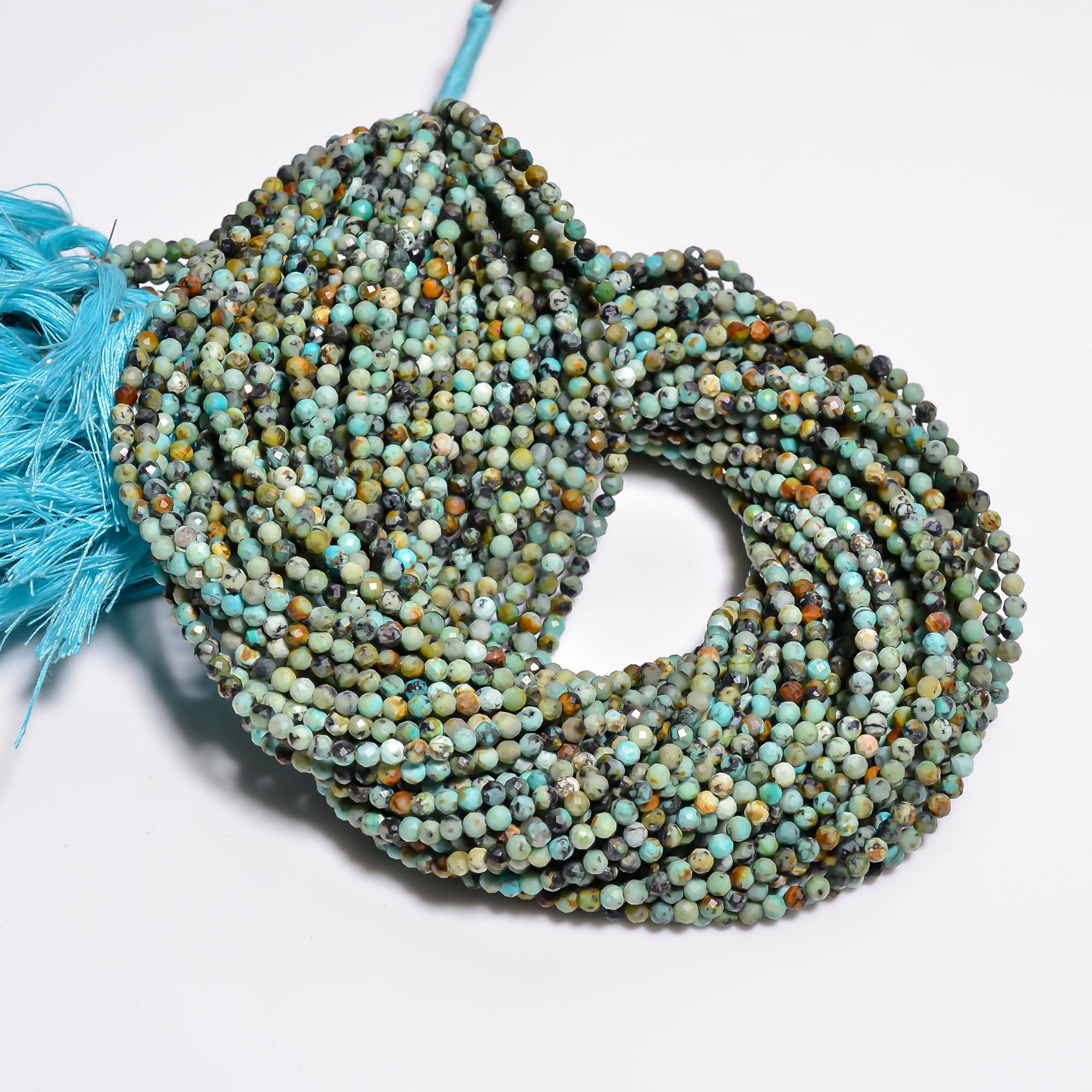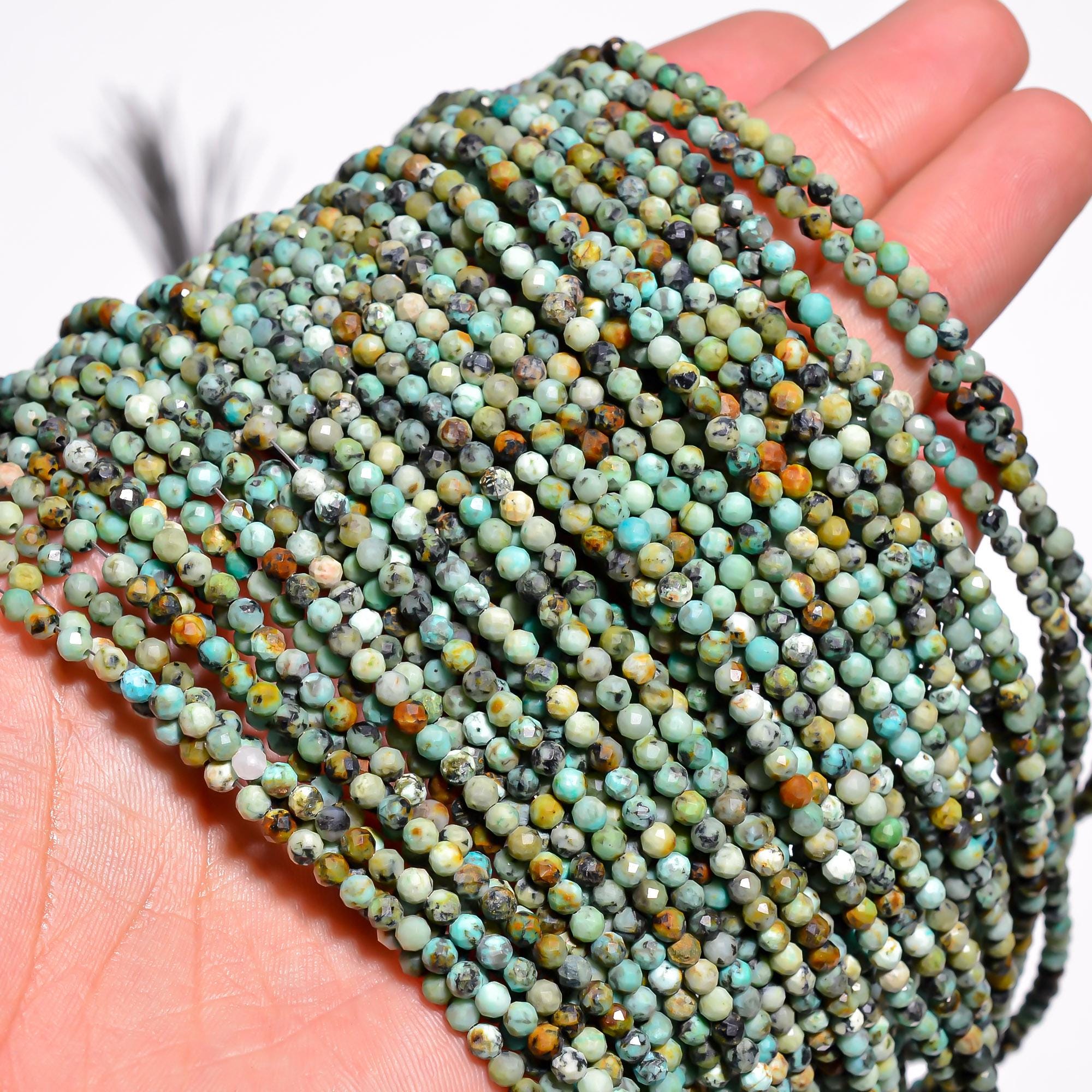 -Turquoise faceted round shape-bead size is from 3.20mm to 3.30mm-hole size of bead is about .50mm-strand length is 13 inches-this listing is for one strand-Turquoise is a natural stone, no treatment