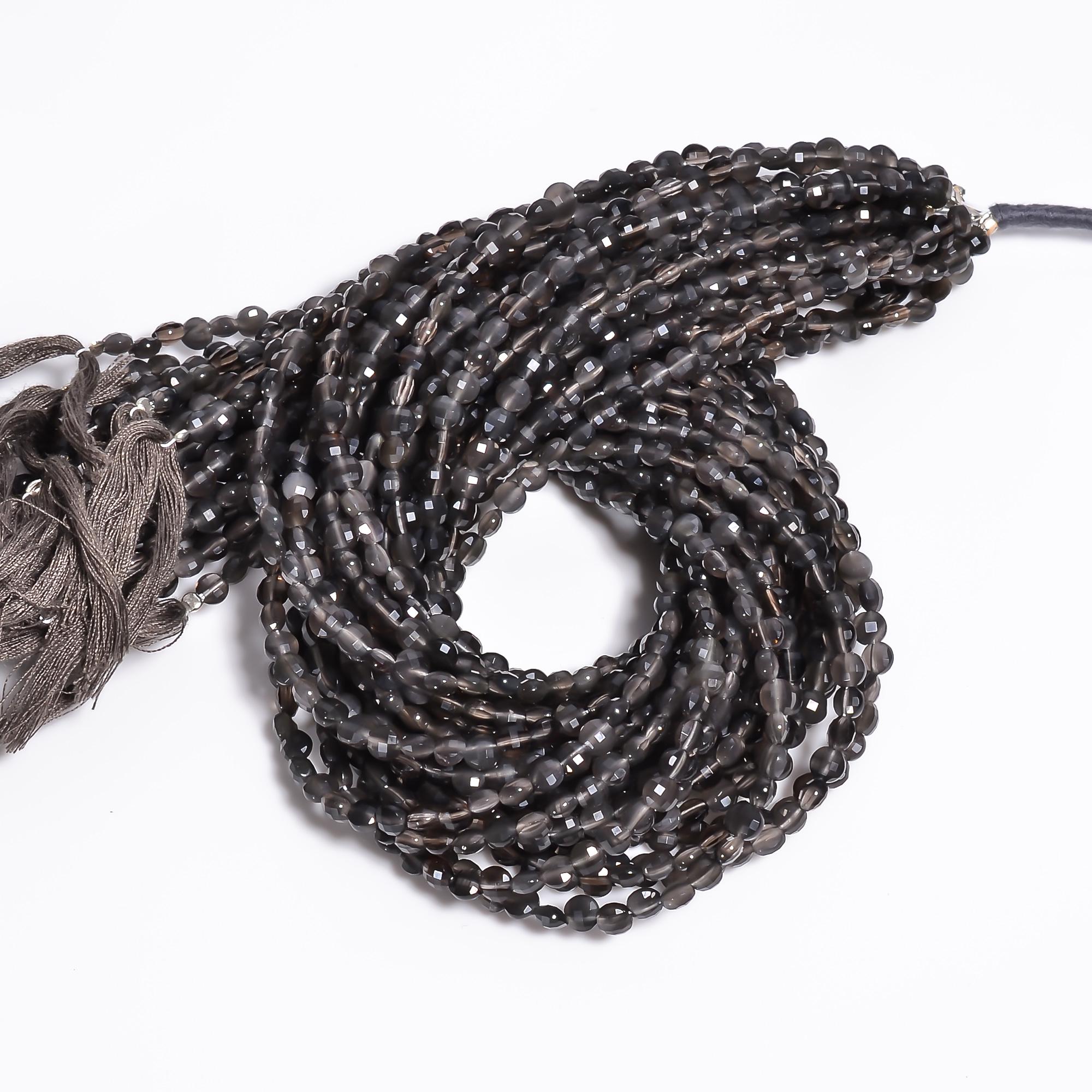 -Gray Moonstone faceted coin shape-bead size is from 4.70mm to 4.80mm-hole size of bead is about .50mm-strand length is 13 inches-this listing is for one strand-Gray Moonstone is a natural stone, no treatment