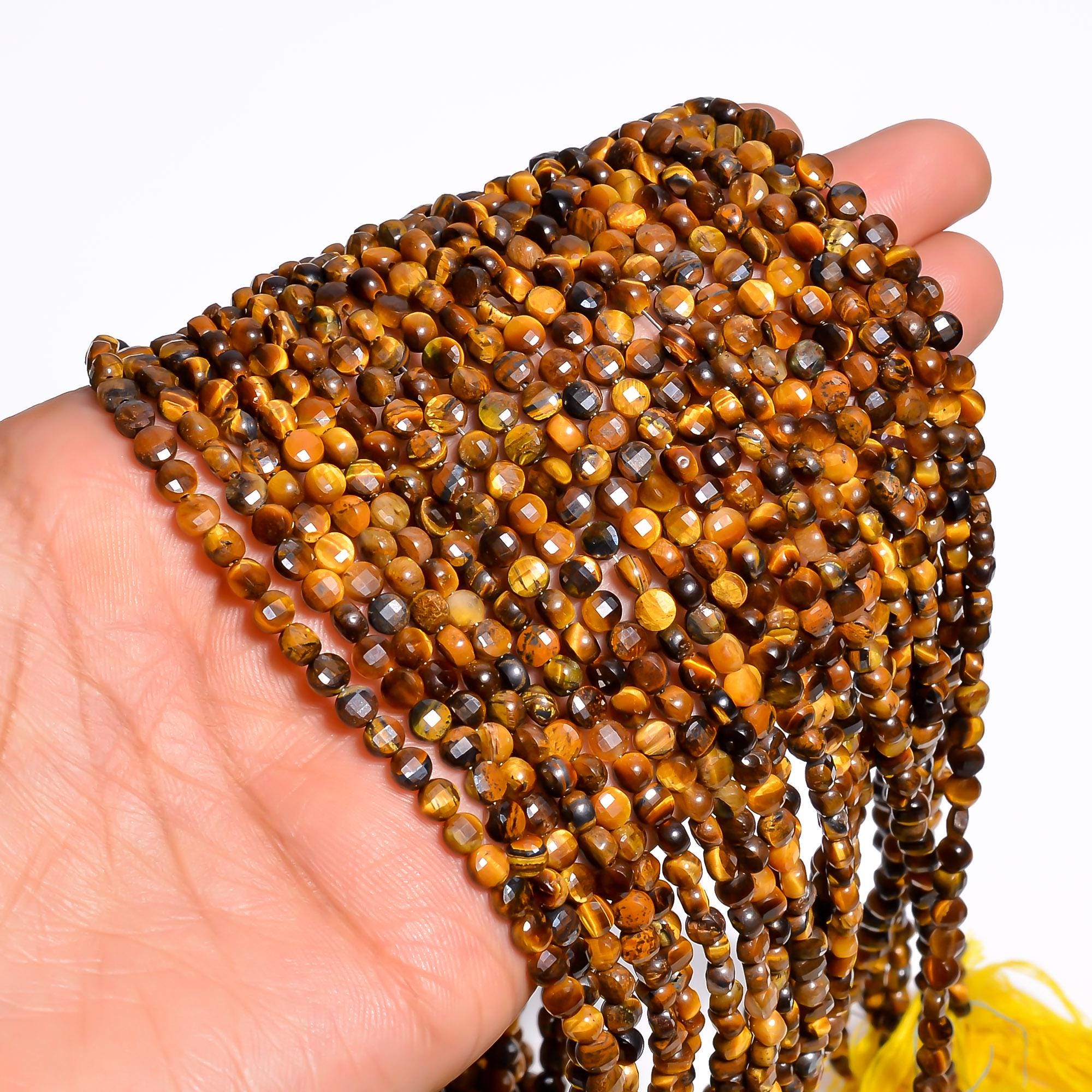 -Tigers Eye faceted coin shape-bead size is from 3.95mm to 4.05mm-hole size of bead is about .50mm-strand length is 13 inches-this listing is for one strand-Tigers Eye is a natural stone, no treatment