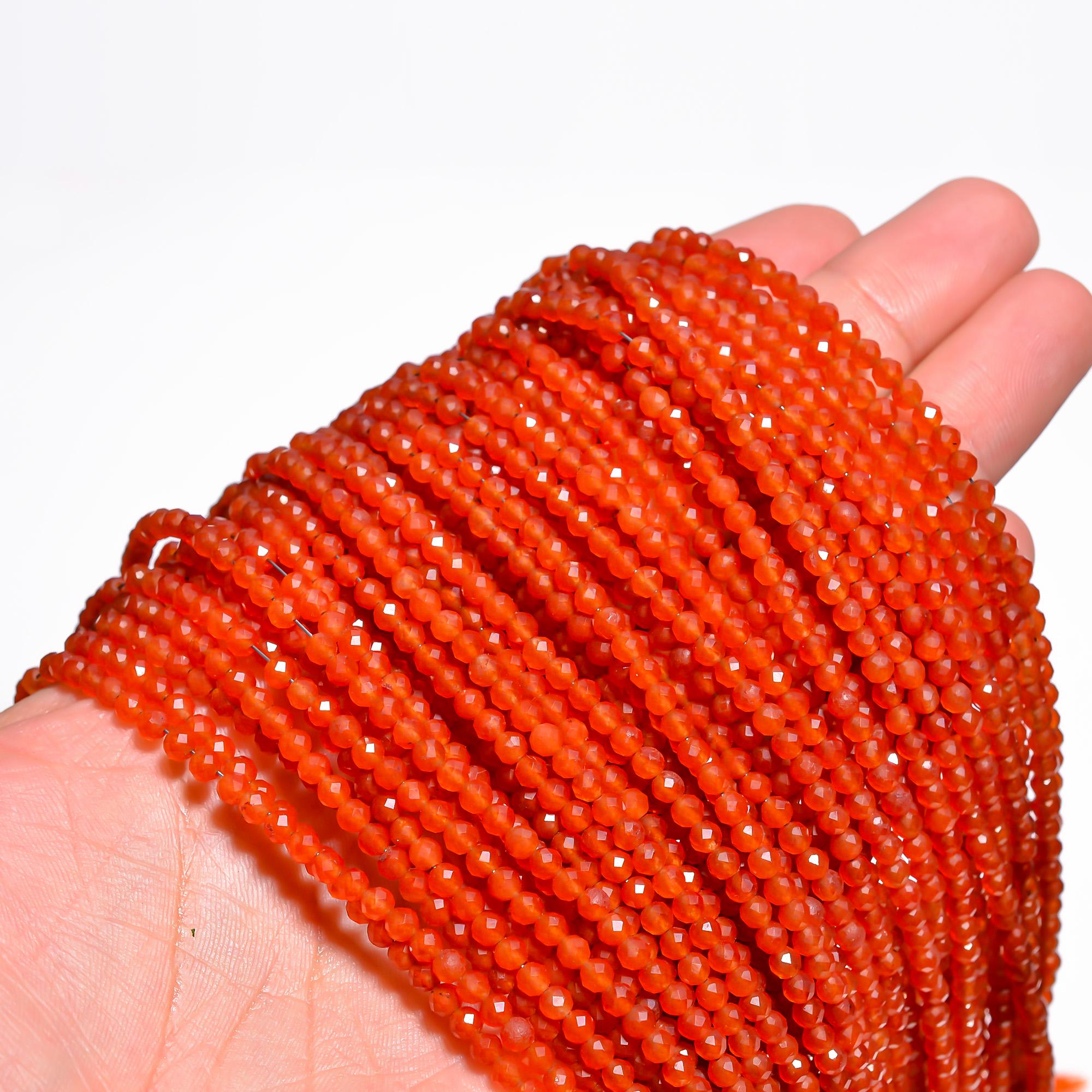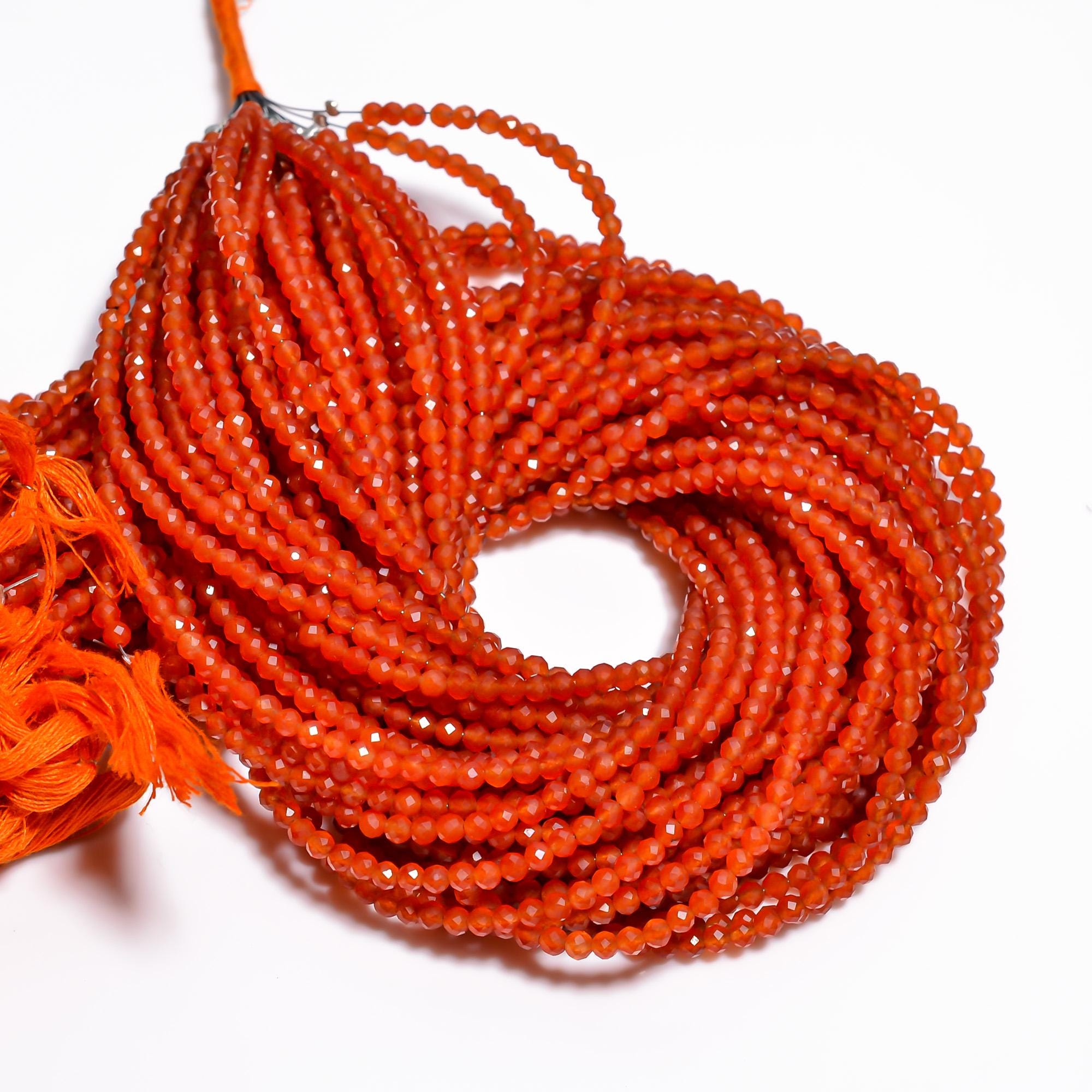 -Carnelian faceted round shape-bead size is from 3.35mm to 3.45mm-hole size of bead is about .50mm-strand length is 13 inches-this listing is for one strand-Carnelian is heat treated to enhance the orange color